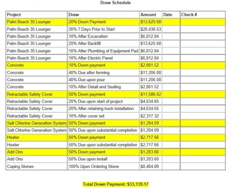 Draws and down payments are a very large and important part of a construction project. The way a pool installer sets up draws should be carefully considered. It is important that neither the pool builder nor the client is ahead or behind the other. Otherwise, it could end up creating a hostage situation. If a pool contractor is not good with finances, they may be cash flowing other jobs with YOUR money and at some point be unable to complete jobs. You don't want to be the last one when the music ends. It happens A LOT.