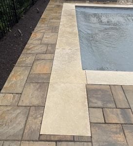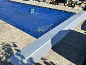 There are a couple of ways that an autocover vault can be covered. A coping stone lid is the most solid but most expensive. Special heavy duty brackets are installed by the coping installer to support the stones. The stones lay dry, look integrated, but are not truly adequate for regular traffic. When the coping stone brackets are used, a stone OR poured lid that matches your concrete can be installed. (see above)